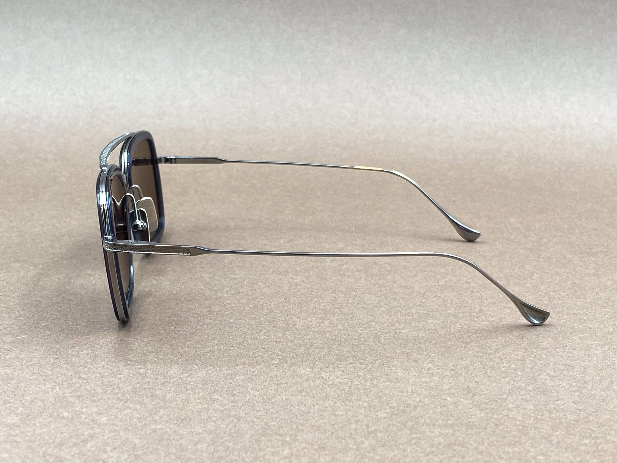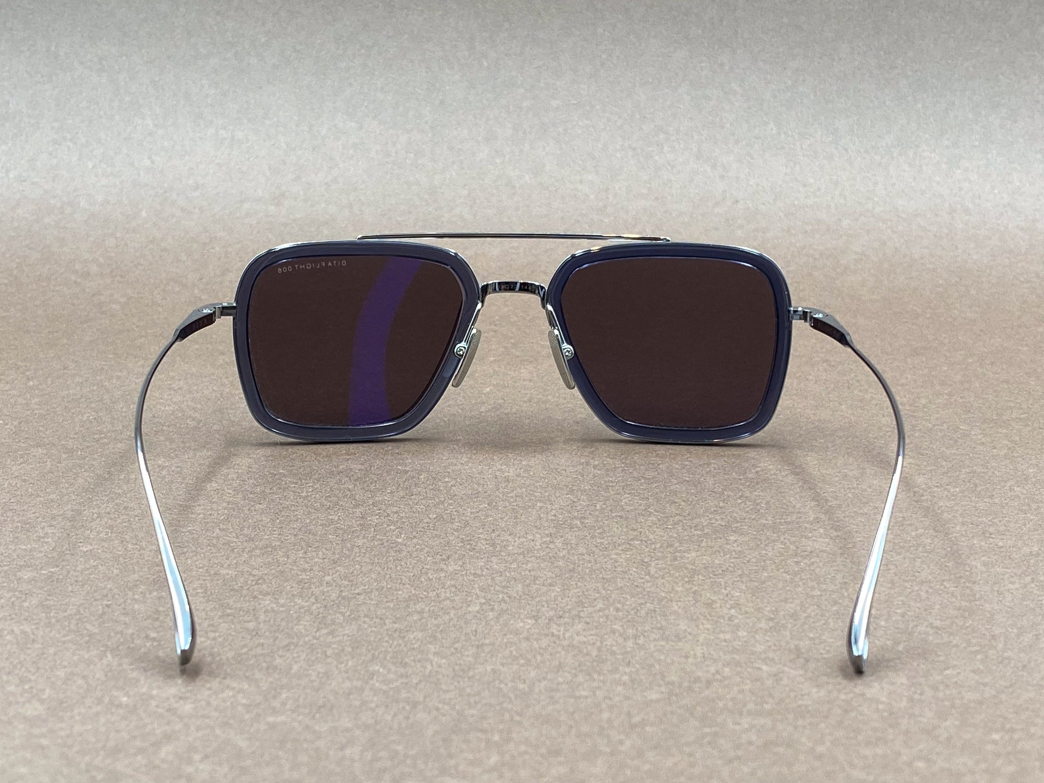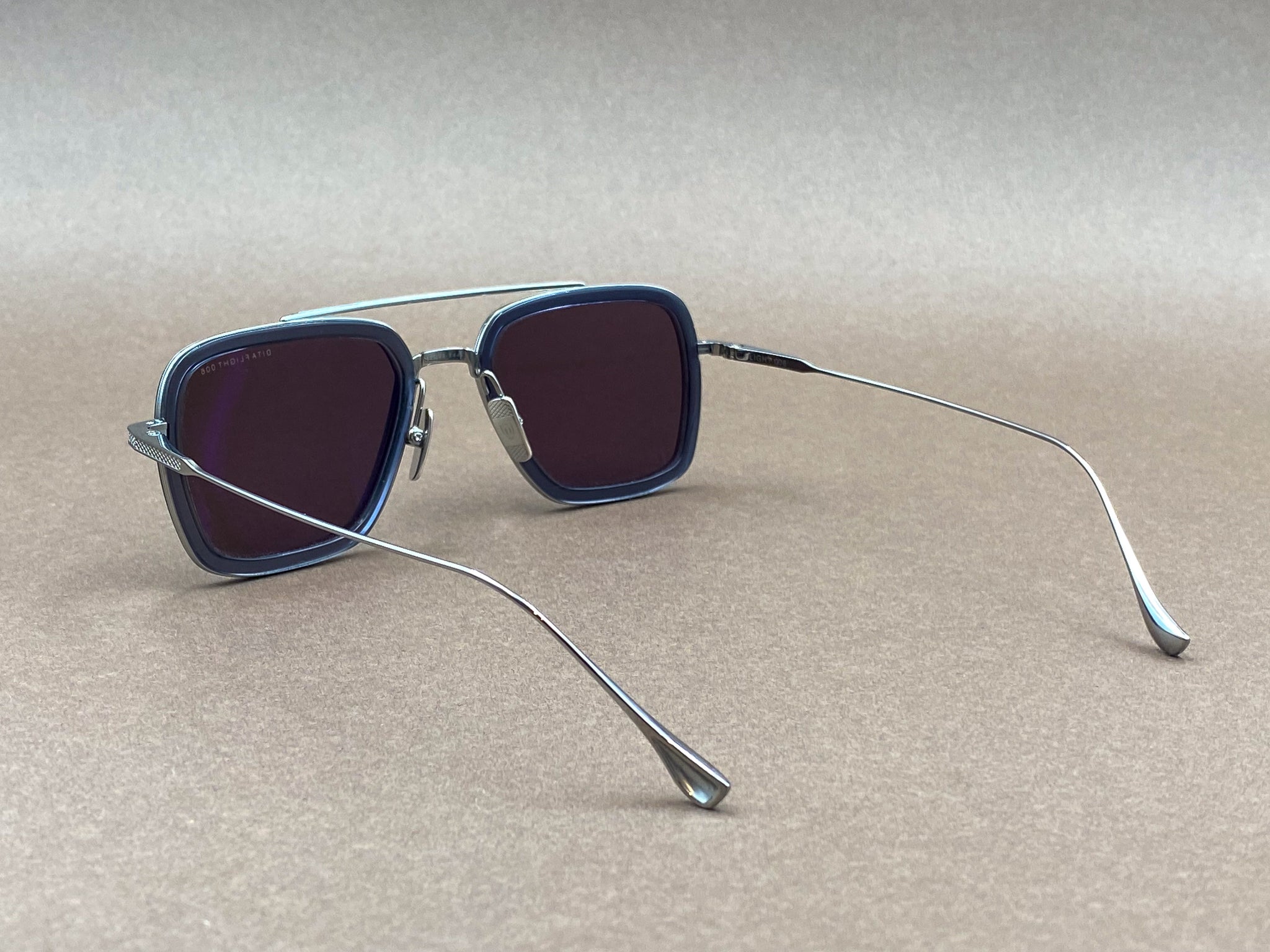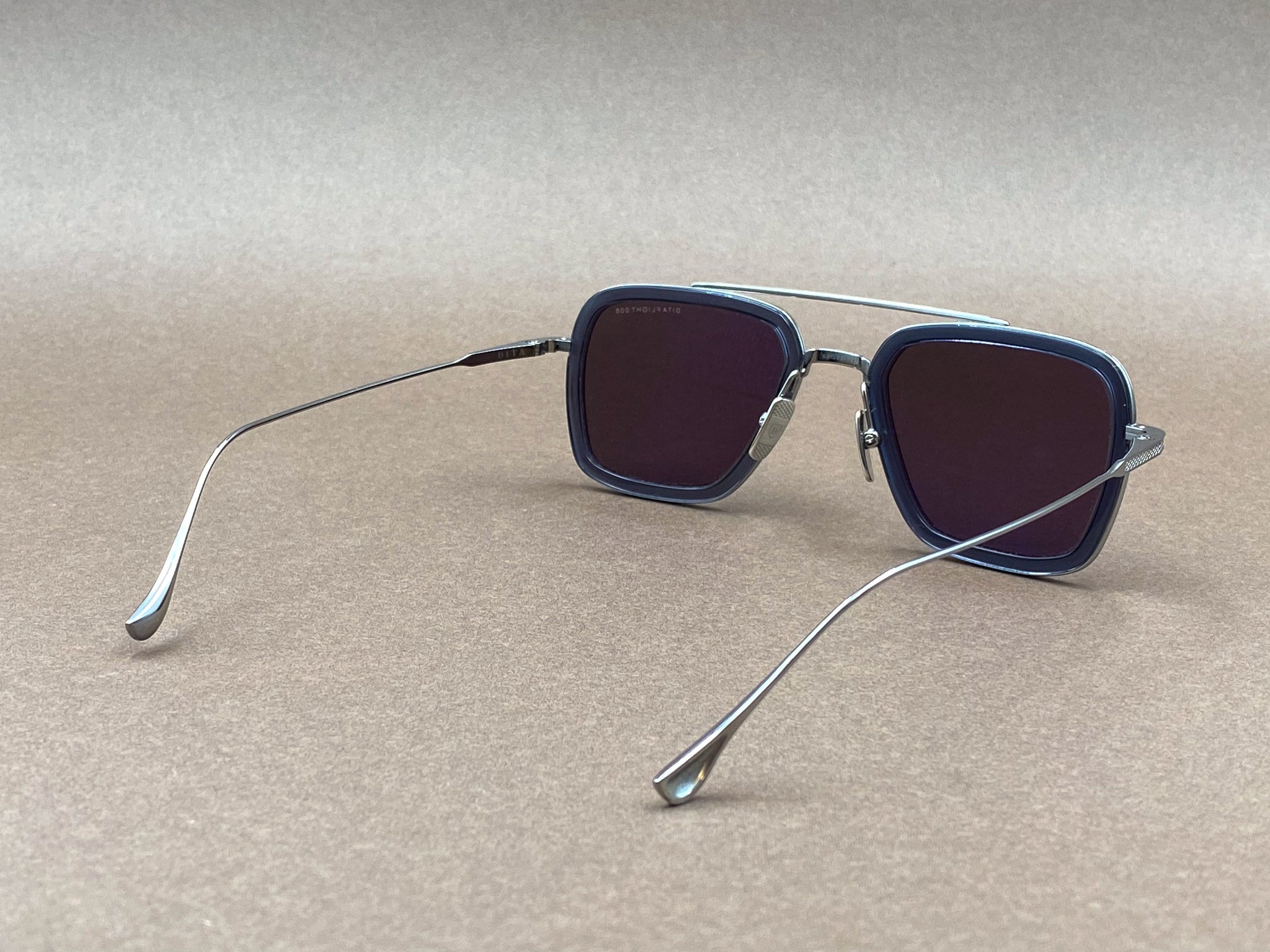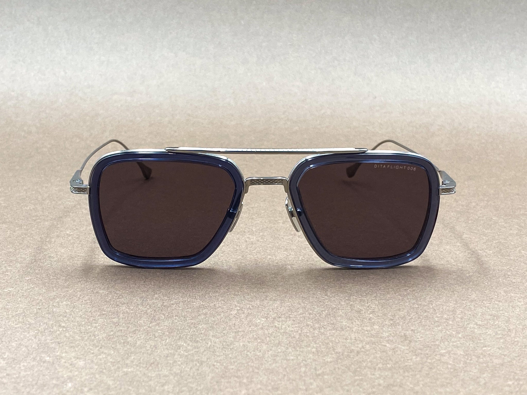 Introducing the Flight 006 sunglasses, it reimagines the classic aviator through a modern squared silhouette and elevated materials. Deep dark-blue acetate rims are combined with lightweight silver titanium frame and temples, creating a confident contrast between bold presence and technical mastery.